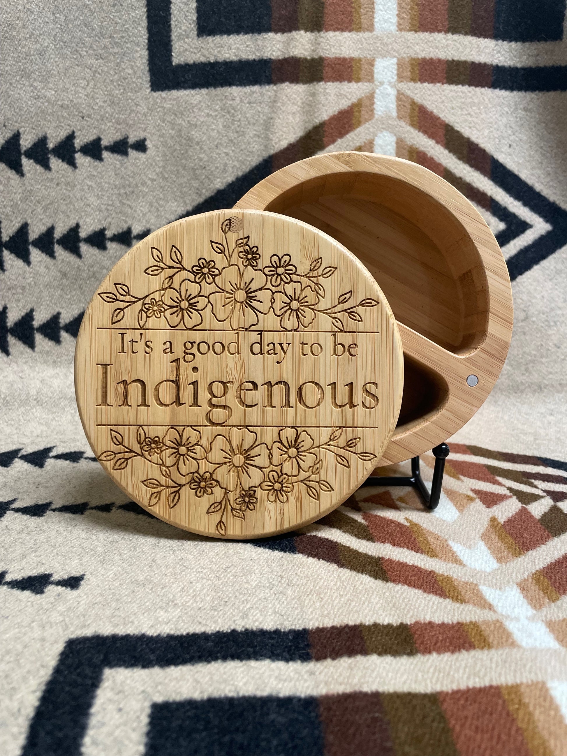 Custom Engraved Goody Day to be Indigenous pattern on a Totally Bamboo Salt Keeper Duet Bamboo Salt Box. Ingenious magnetic lock and a swiveling lid design makes it easy for busy cooks to quickly grab a pinch of seasoning with just one hand. Masterfully crafted from organically-grown bamboo, the twin compartments store a up to a 1/2 cup each. This handy storage solution is great outside of the kitchen too: use it to store jewelry, office supplies, knickknacks and more!